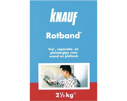 Knauf Roodband Rotband® in kleinverpakking 1 kg en 2,5 kg is een vul-, reparatie- en pleistergips inéén. Te gebruiken bij een diepe beschadiging, die groot in omvang is. Toe te passen over steenachtige ondergronden. Binnenshuis toe te passen. Voor wanden en plafonds.